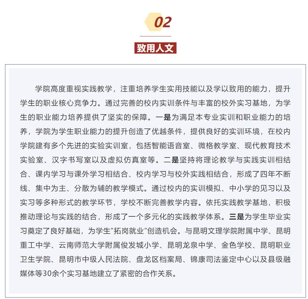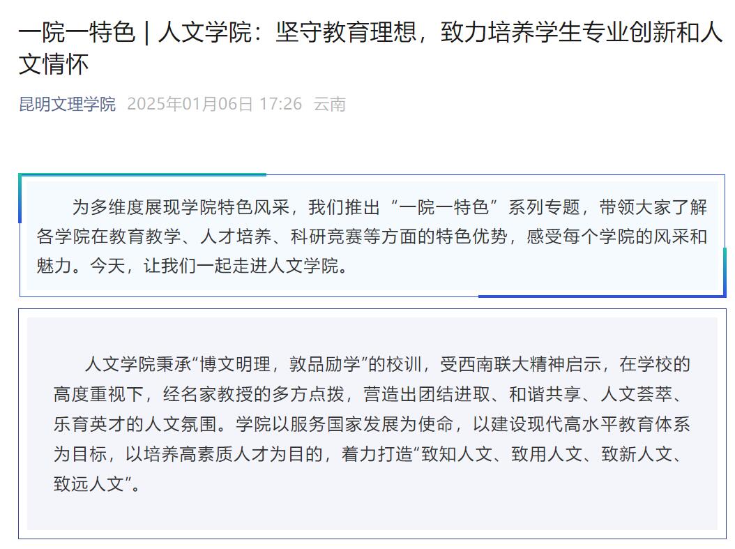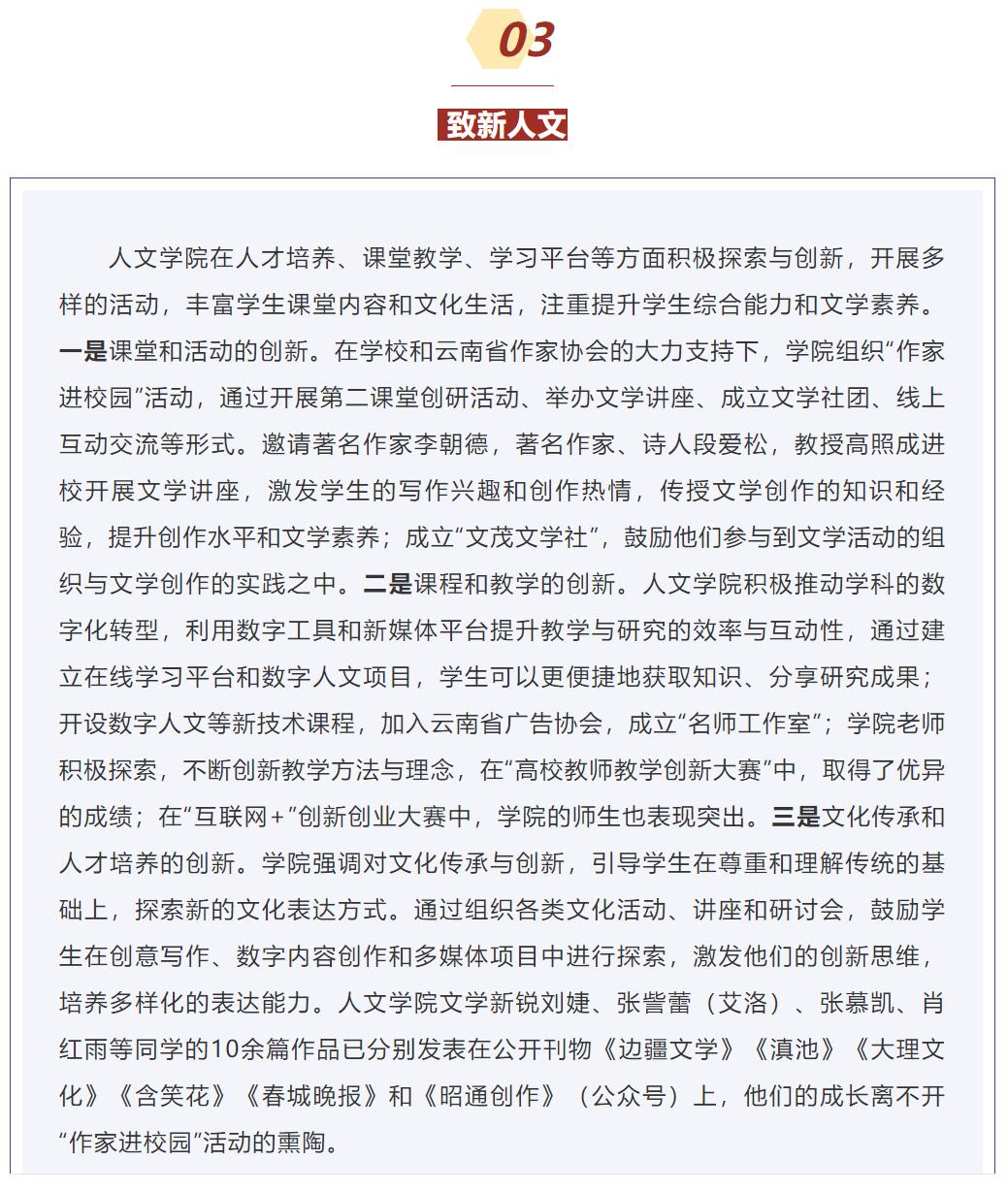人文学院秉承“博文明理,敦品励学”的校训,感恩西南联大精神的启示,承蒙学校的高度重视,名家教授的多方点拨,营造出团结进取、和谐共享、人文荟萃、乐育英才的人文氛围。学院以服务国家发展为使命,以建设现代高水平教育体系为目标,以培养高素质人才为目的。这里是学子筑梦的摇篮,这里是理想启航的港湾,这里是驶向成功彼岸的驿站。