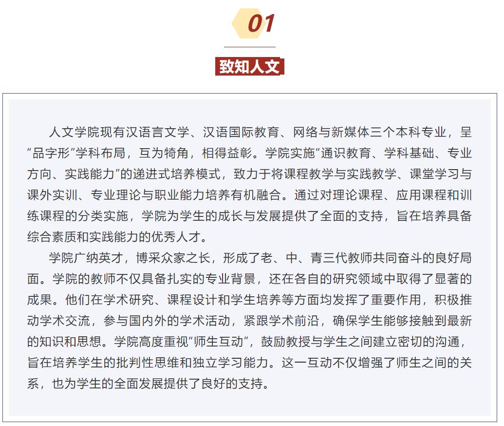 在人文学院深造是理想的选择,愿今天的学子、明日的英才在这里收获知识,谋划未来,展现鸿鹄之志,书写壮美人生。