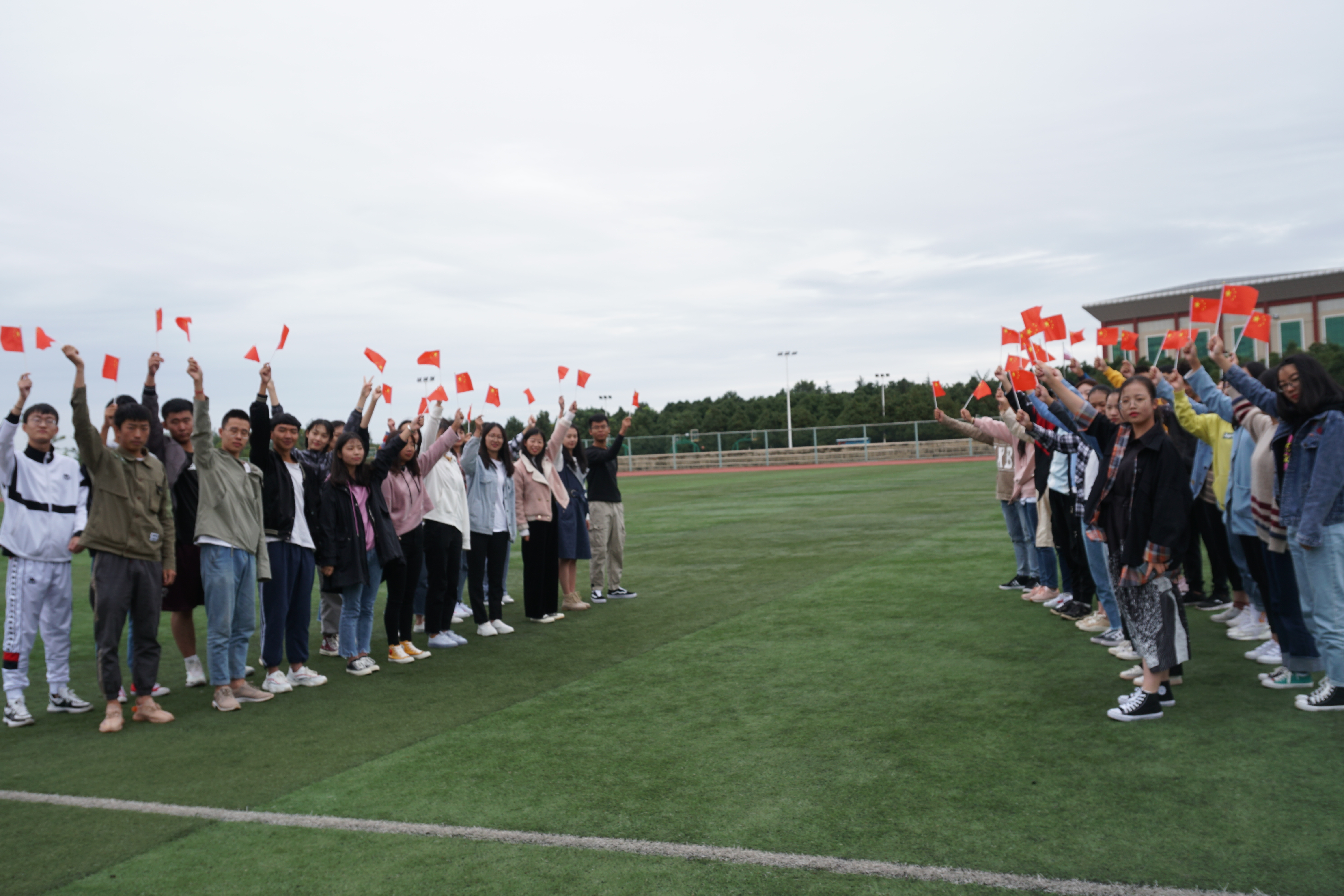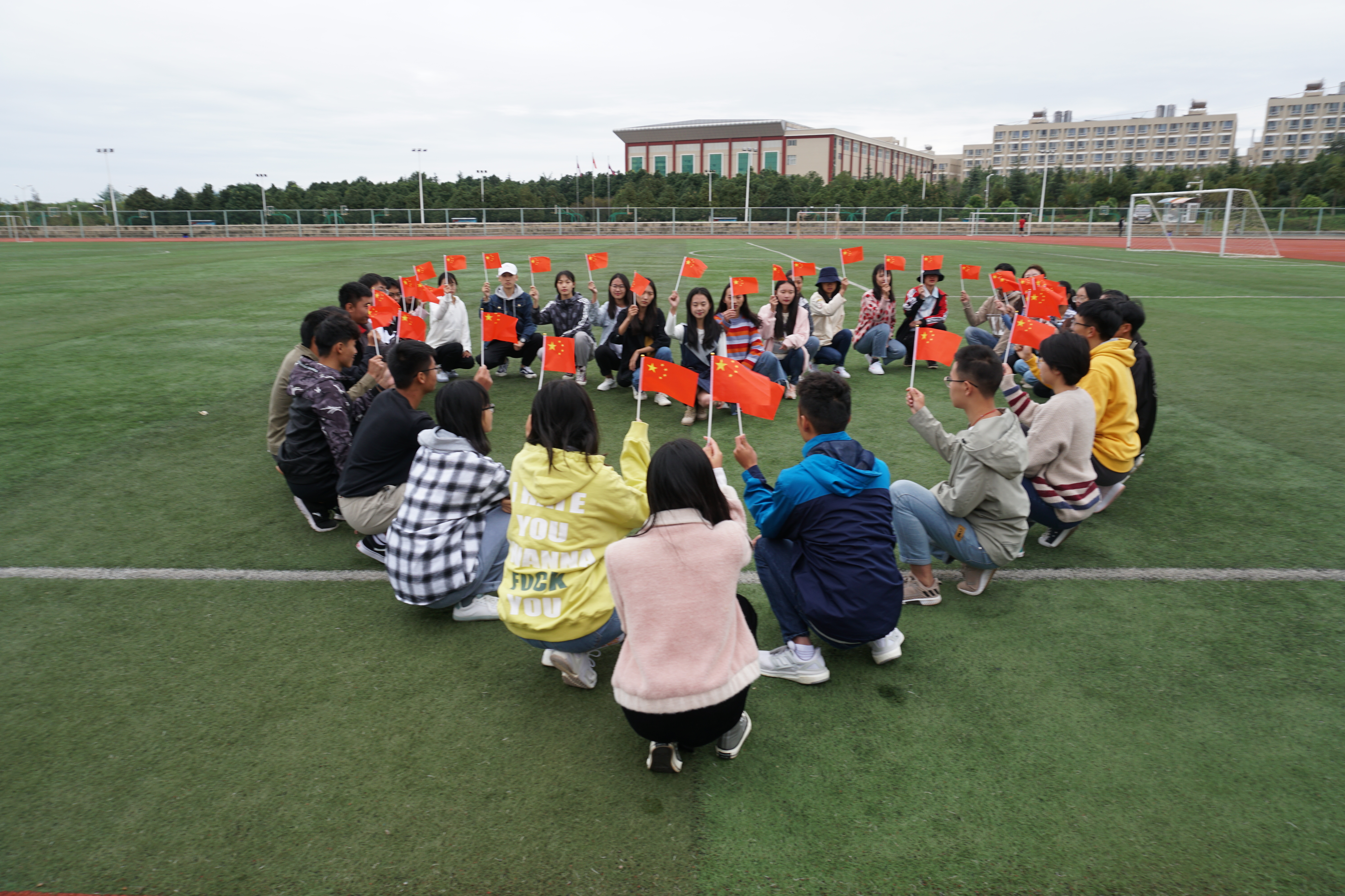 在运动场的绿茵上,同学们挥舞国旗摆成心形,是对祖国的告白;新篮球场边的阶梯上,同学们举着院旗,高喊“传中华人文经典,颂祖国七十荣光,人文学子祝祖国生日快乐!”。情之所至,一段话徒然跃上心头“少年中国,与天不老;中国少年,与国无疆。吾心往之,吾意属之,吾国强之。”