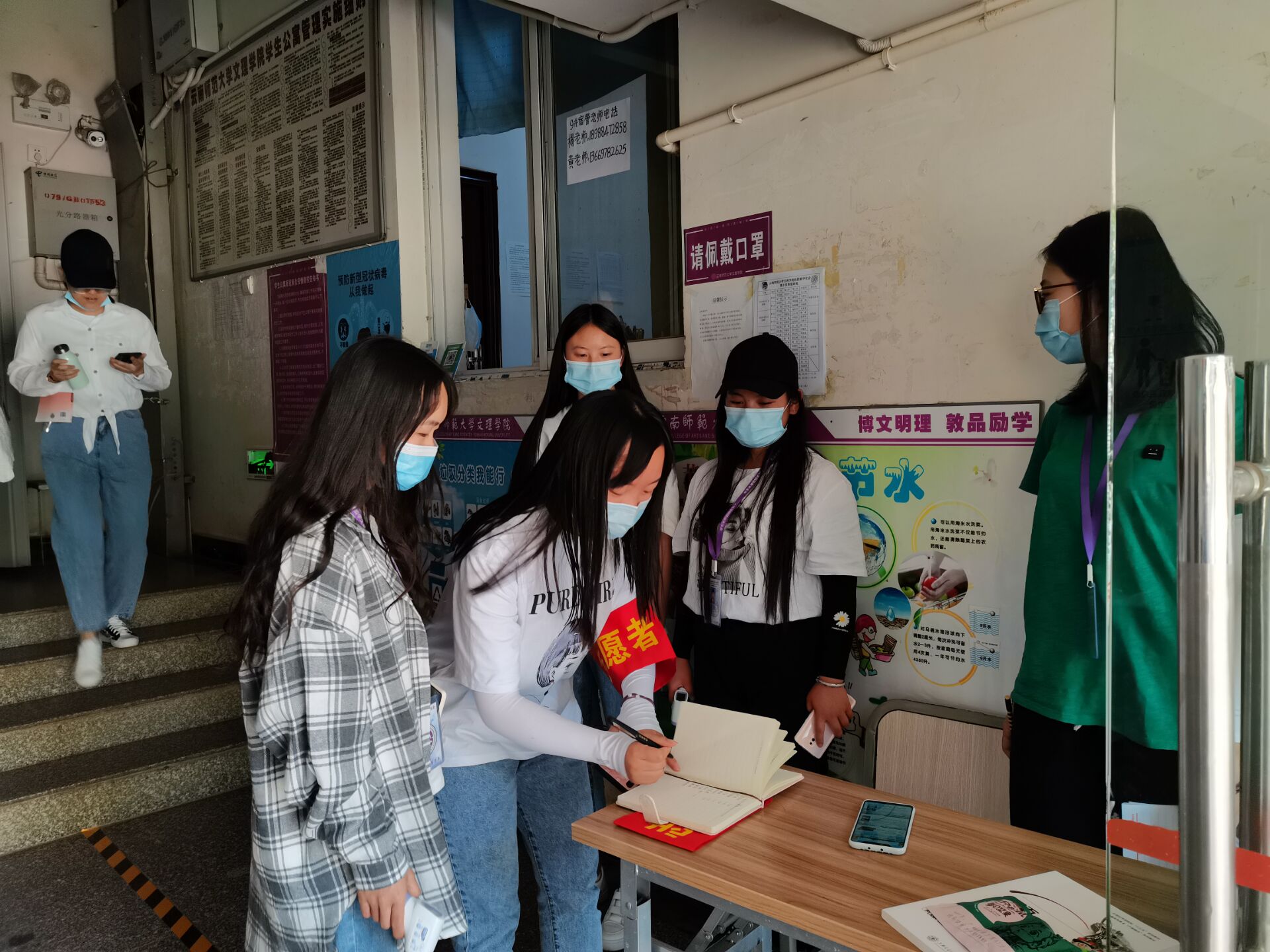 我院的志愿者们主要负责宿舍楼的防疫工作,为出入宿舍的同学们测量体温,做好出入体温异常登记工作,并提醒同学们戴好口罩,注意自我防护;他们井然有序的忙碌着,默默的履行着一个志愿者的职责,经过这段时间以来的坚守,他们虽然身体疲累,也舍弃了自己的部分休息时间,在宿舍楼层做着枯燥的防疫工作,但是他们深知自己的职责,为了疫情防控,他们以饱满的热情投入到日常防疫工作之中,没有一丝懈怠。