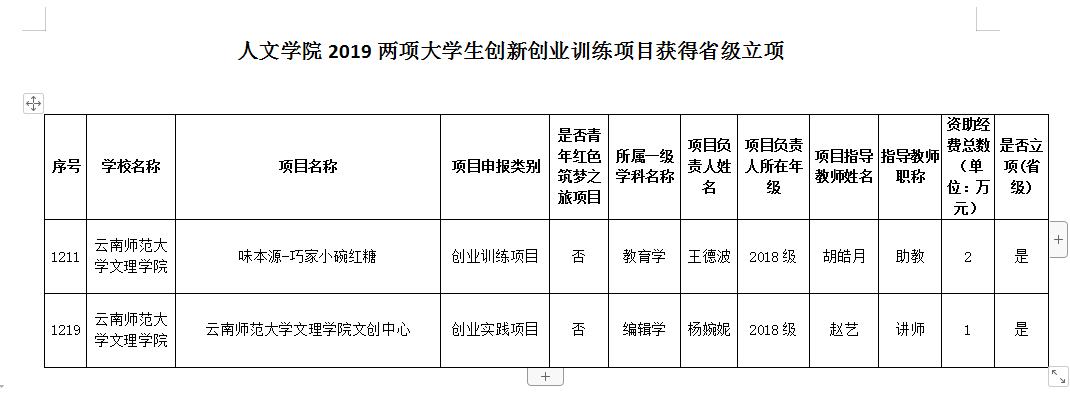 人文学院2019年两项大学生创新创业训练项目获得省级立项