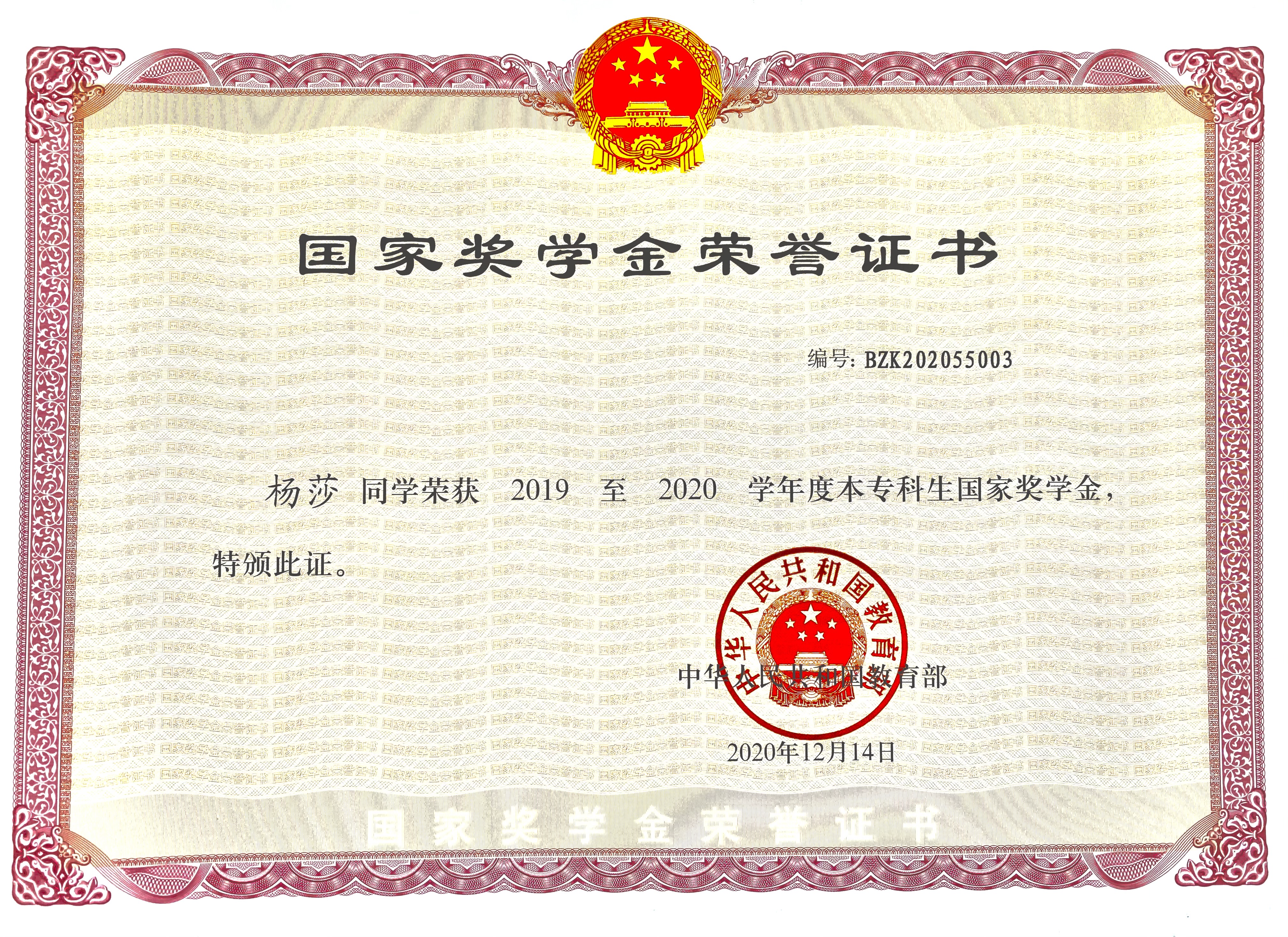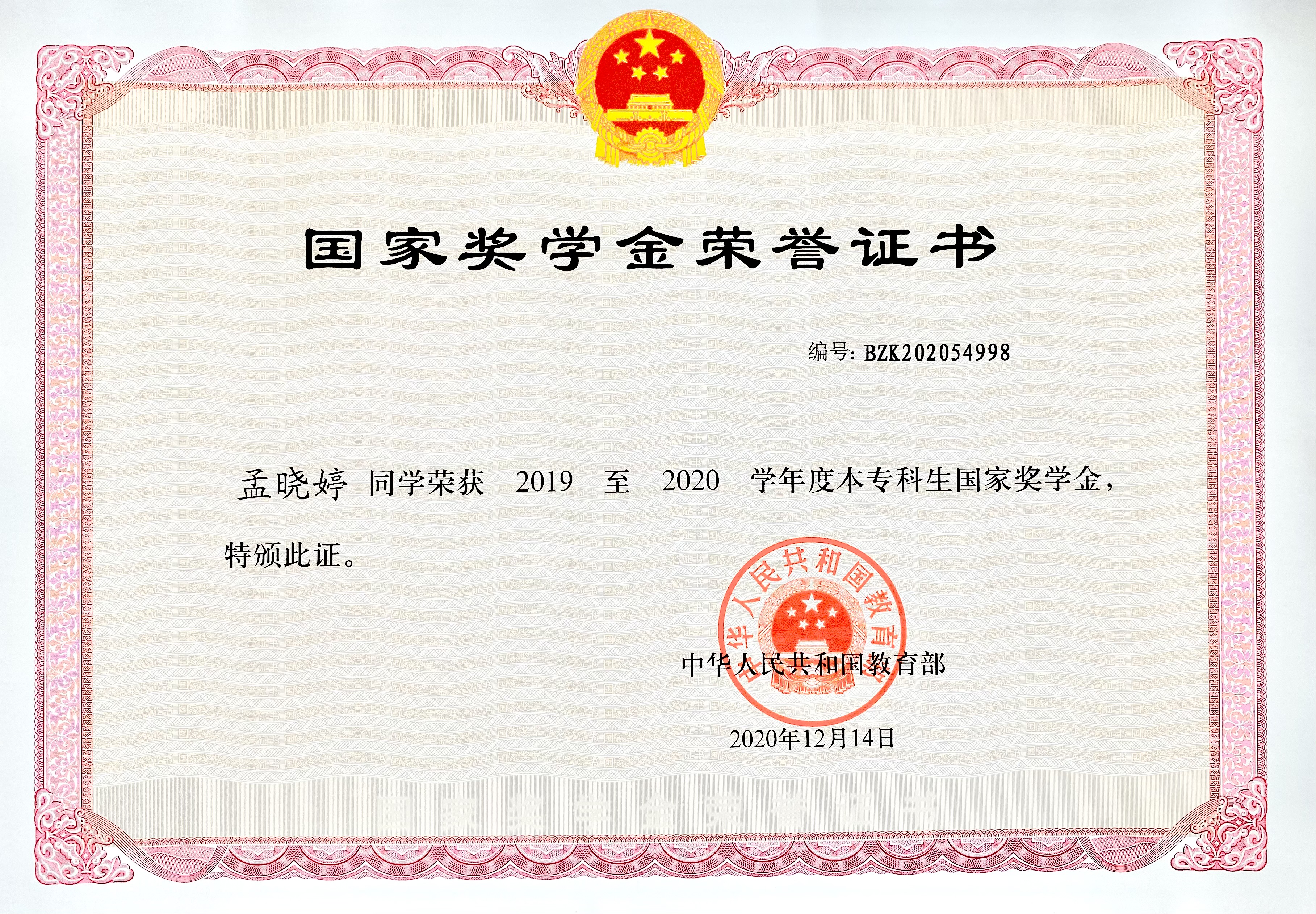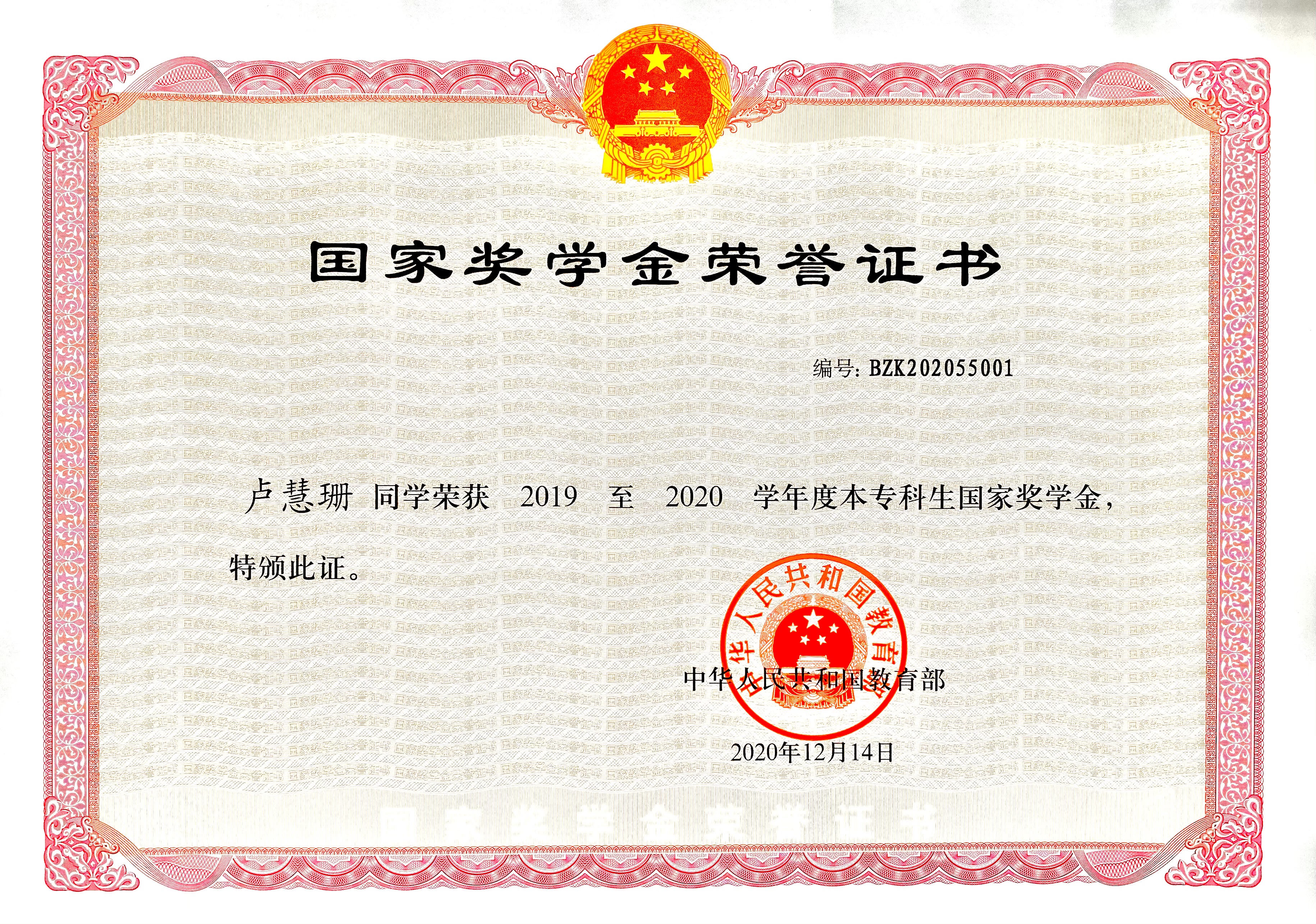 学习成绩专业和综测成绩均居班级年级第一。顺利通过普通话二甲、英语四级和高中语文教师资格证面试,在学习上为同学们做出表率。曾任职一年校团委副书记现担任副班长一职,在大学期间主要获得以下奖项: 2019年9月获国家励志奖学金;2018年5月获三笔字技能大赛一等奖、2018年11月获全国书法青少年组二等奖;2019年9月获省级”三好学生“2018年12月获校级“三好学生”,2020年6月获校级“优秀共青团员;、2020年6月获校级“三好学生”。