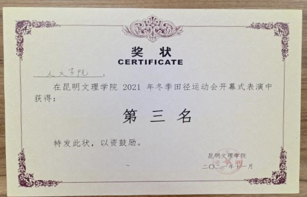 开幕式上学院舞蹈方阵的表演匠心独运。同学们一身白衣如雪,手持火红舞扇,宛如雪地中那齐放的红花,意境丰盈,婉转动人。中间穿插的街舞表演古今结合、力与美相糅,赢得了主席台领导和满场观众的掌声,并且获得本次运动会开幕式表演第三名。