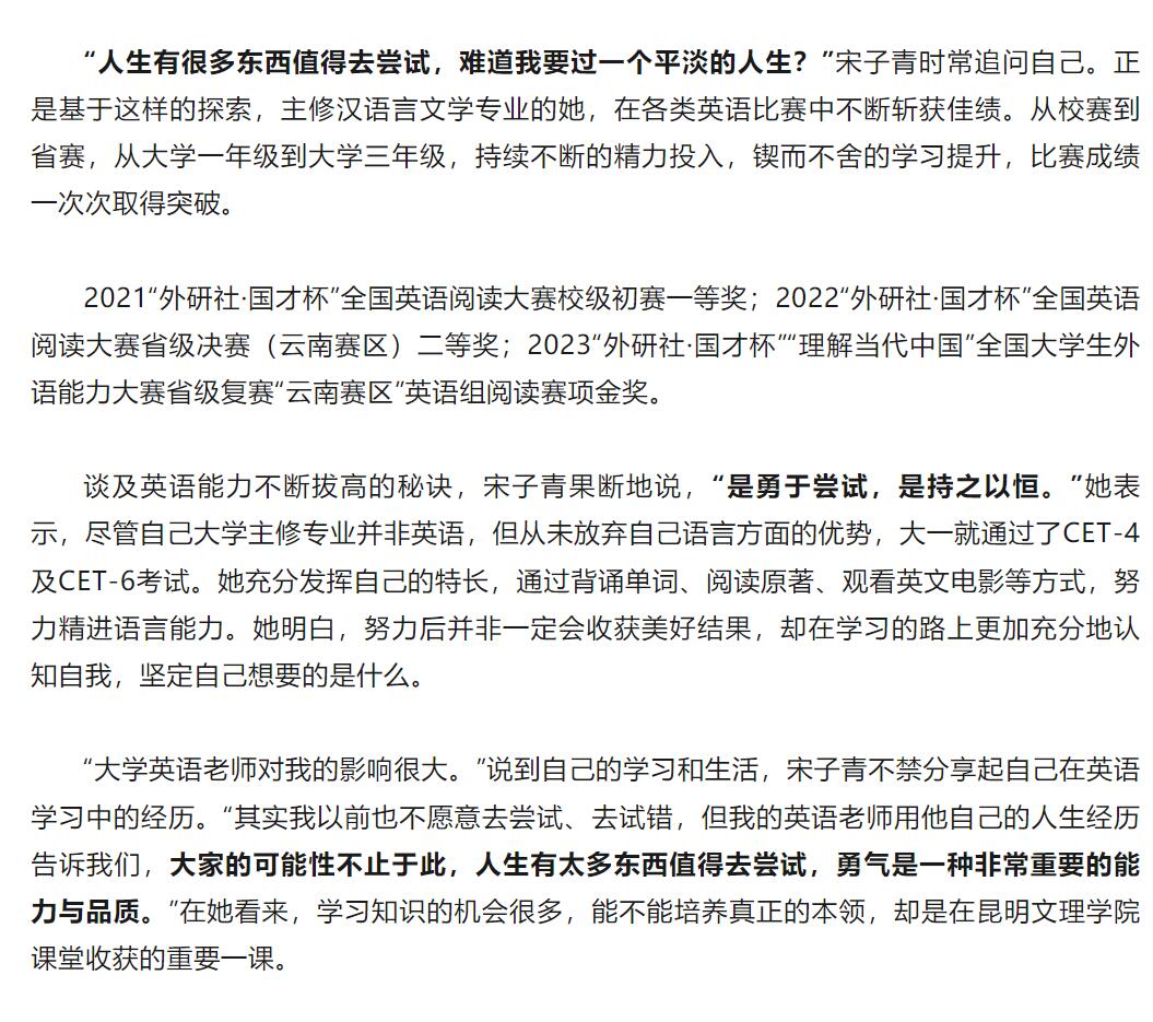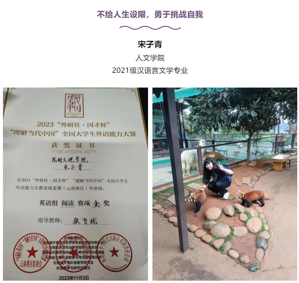 11月3日,2023“外研社·国才杯”“理解当代中国”全国大学生外语能力大赛云南赛区成绩出炉,昆明文理学院2名学生斩获金奖,成功晋级国赛!其中1人为人文学院2021级汉语言文学宋子青同学。下面是昆明文理学院公众号对宋子青同学的专访: