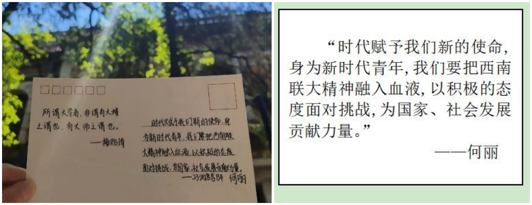 同学们在深入了解西南联大英烈的感人事迹后,内心深受触动,纷纷提笔写下自己的感悟。写道:“时代赋予我们新的使命,身为新时代青年,我们要把西南联大精神面融入血液,以积极的态度面对挑成,为国家、社气发展贡献力量。”这些承载着青春思考的文字,成为新时代青年与烽火年代理想主义者跨越时空的击掌相鸣。
